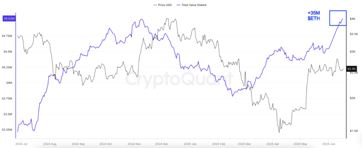 Over 500,000 ETH has been staked in the first half of June, signaling “rising confidence and a continued drop in liquid supply,” said pseudonymous CryptoQuant author Onchainschool in a Tuesday post.