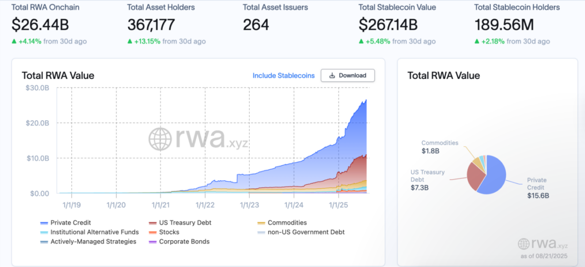 The tokenized RWA sector grew by about 65% since the beginning of 2025, surging to a market capitalization of over $26.4 billion, excluding stablecoins, according to RWA.xyz.