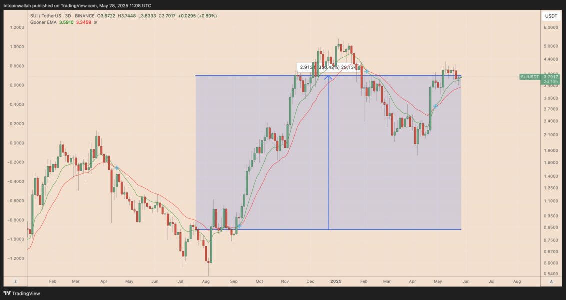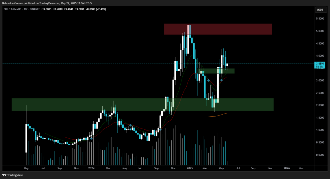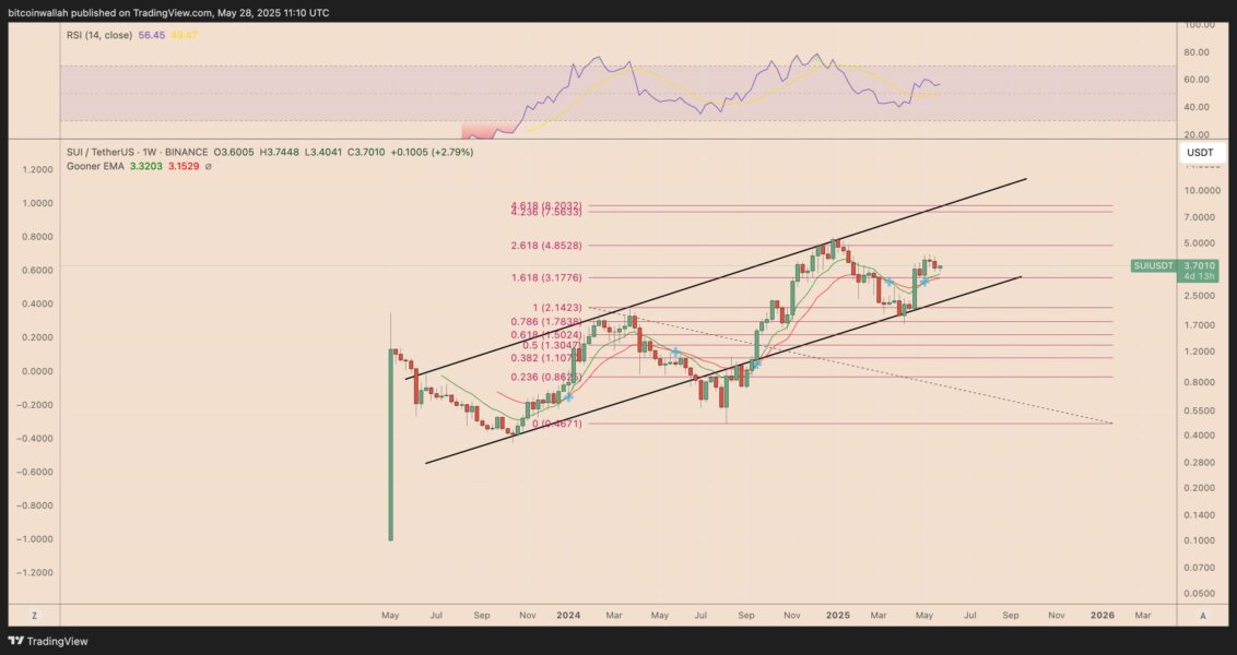 As of May 28, SUI has reclaimed the “Gooner EMA” as support on the weekly chart.