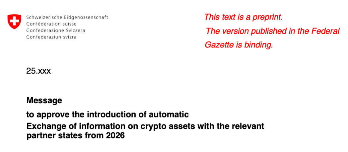 The new proposal follows the Federal Council’s dispatch on the international and national legal bases for the AEOI concerning crypto assets adopted on Feb. 19, 2025.