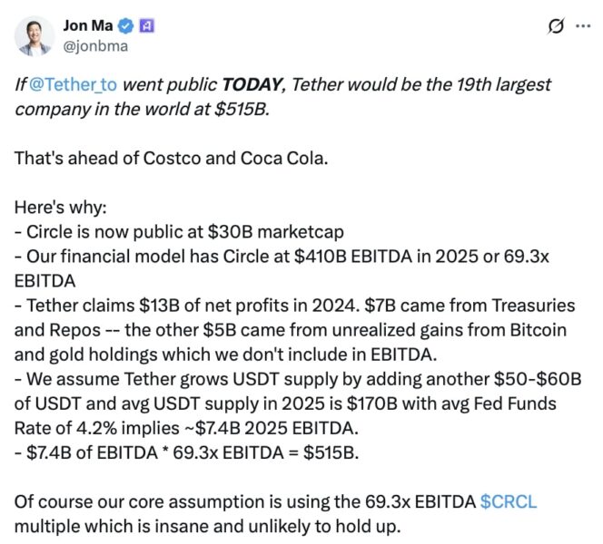 Ardoino addressed valuation speculation raised by Artmesis CEO Jon Ma, who claimed that if Tether, which is behind the stablecoin USDT, were to go public, it would rank as the 19th largest company globally with a valuation of $515 billion, larger than multinational giants like Costco and Coca-Cola.