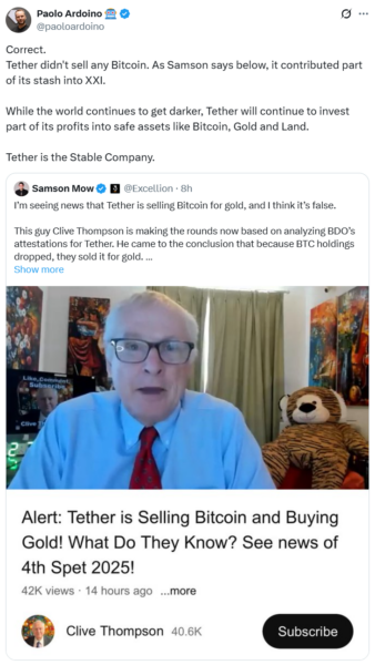 In a Sunday post on X, Ardoino said the company “didn’t sell any Bitcoin,” and reaffirmed its strategy of allocating profits into assets like “Bitcoin, gold, and land.”