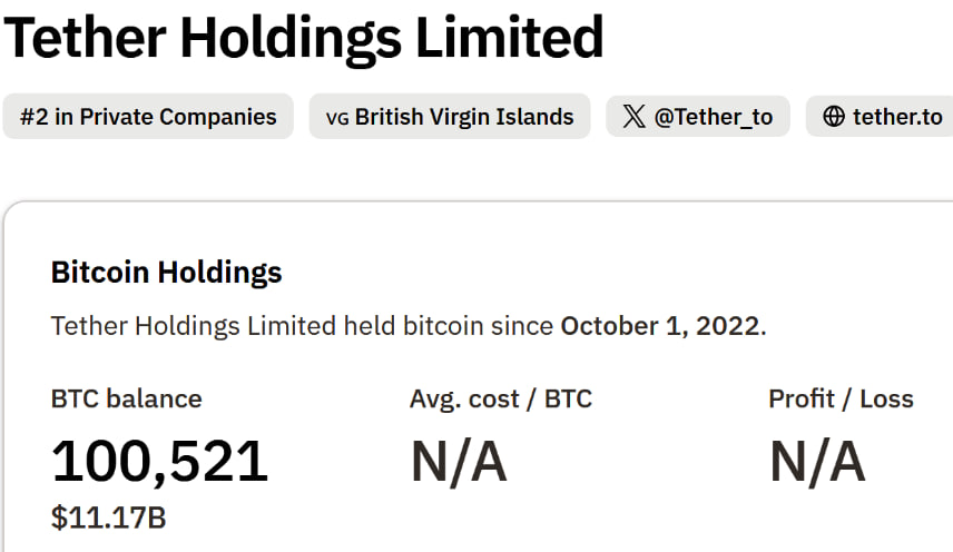 Tether, the issuer of the USDt stablecoin, holds over 100,521 BTC, worth around $11.17 billion, according to data from BitcoinTreasuries.NET.
