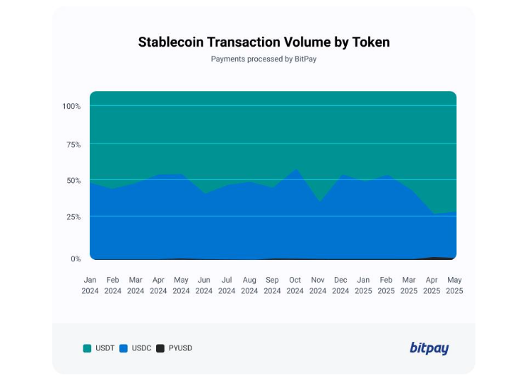 “In 2024, USDC was the token most commonly used. However, starting in March of 2025, USDT gained a sizable share of transaction volume, exceeding 70% of stablecoin volume processed by BitPay,” the crypto payment firm said.