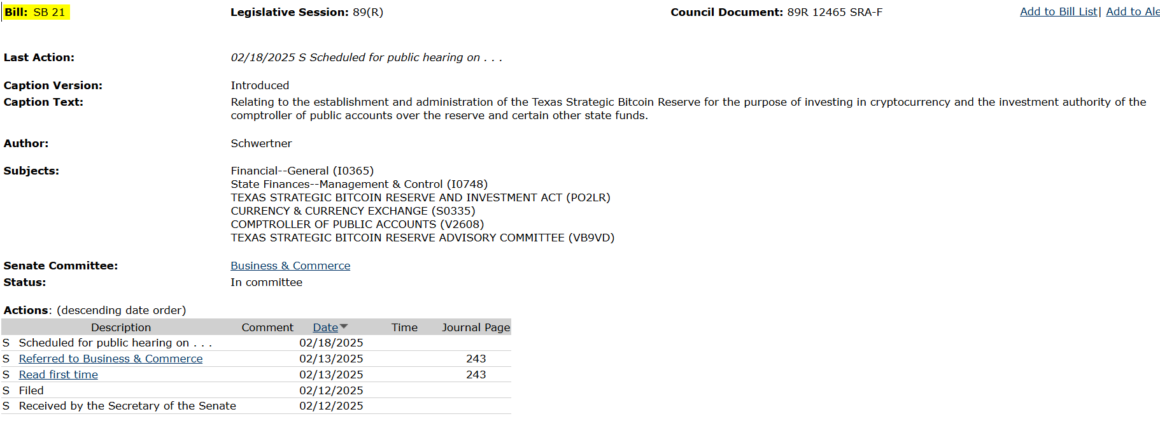 The first public hearing for the establishment of a potential strategic Bitcoin reserve in Texas is scheduled for Feb. 18, less than a week after the bill was received by the Secretary of the Senate, according to the Texas government’s website.