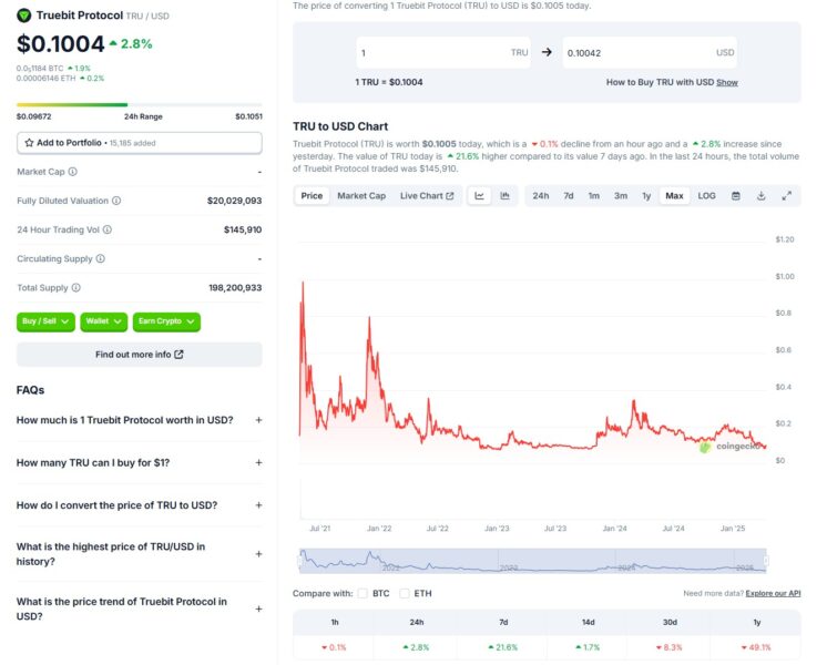 Truebit was launched in 2017 and launched its TRU token in 2021. The token has a fully diluted market capitalization of $20 million, according to CoinGecko.