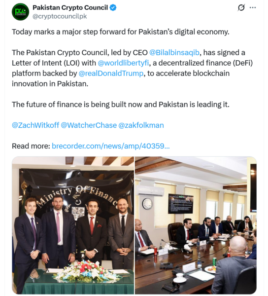 The Donald Trump-backed World Liberty Financial has signed a Letter of Intent with the Pakistan Crypto Council to accelerate crypto adoption in the South Asian country and one of the industry’s fastest-growing markets.