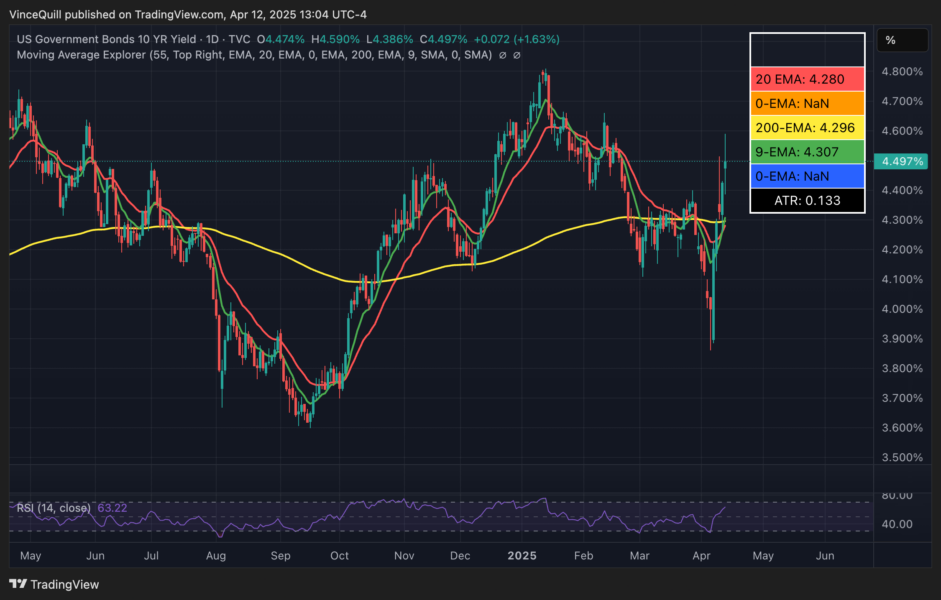 The yield on the 10-year US Treasury Bond shot up to a local high of approximately 4.5% on April 11 as bond investors reacted to the macroeconomic uncertainty of a protracted trade war.