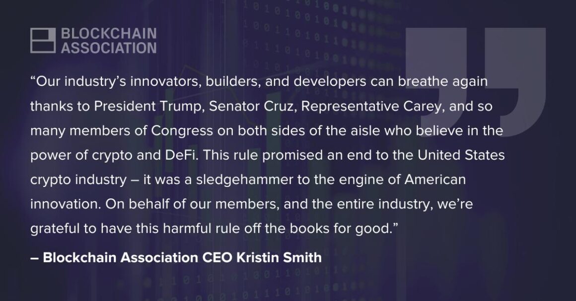 Crypto advocacy group Blockchain Association CEO Kristin Smith said in an April 10 statement the “industry’s innovators, builders, and developers can breathe again,” now the resolution has passed.
