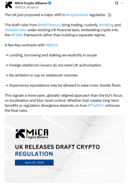 According to the MiCA Crypto Alliance, one key difference is that the UK will allow foreign stablecoin issuers to operate in the UK without needing to register.