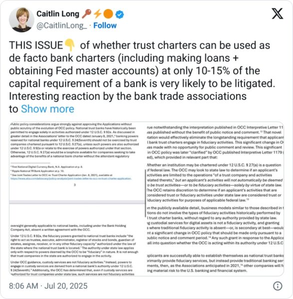 Caitlin Long, the founder of crypto-focused bank Custodia Bank, posted to X on Saturday that the group’s issue on whether trust charters can be used as “de facto bank charters” with just a fraction of the capital requirements is “very likely to be litigated.”