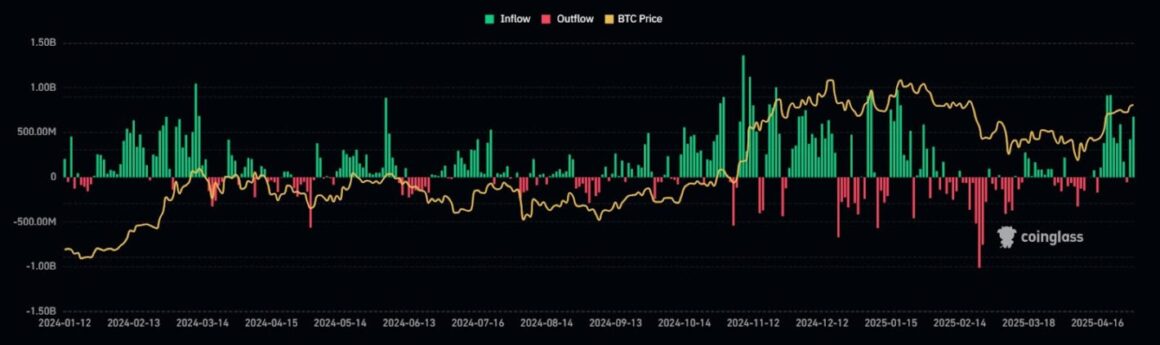 The total inflow for the past five trading days was around $1.8 billion, with a net outflow on April 30, according to Farside Investors. There has only been one outflow day since April 16, as the inflows have mirrored market recovery.