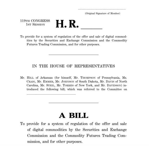 The bill covers the roles of both the United States Securities and Exchange Commission (SEC) and the Commodity Futures Trading Commission (CFTC) on digital assets oversight, seeking to resolve longstanding questions about which agency oversees which types of digital assets.
