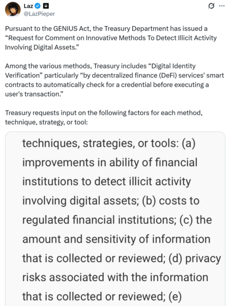 One of the ideas in the request for comment is the potential for DeFi protocols to integrate digital identity credentials directly into their code. Under this model, a smart contract could automatically verify a user’s credential before executing a transaction, effectively building Know Your Customer (KYC) and Anti-Money Laundering (AML) safeguards into blockchain infrastructure.