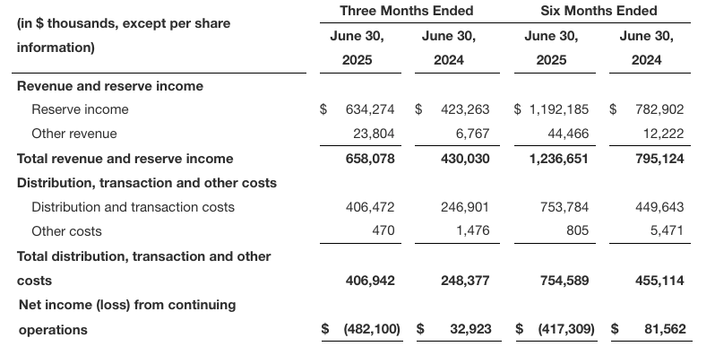 The net loss in Q2 was significantly impacted by expenses from Circle’s initial public offering (IPO), the company mentioned, referring to $591 million in IPO-related non-cash charges.