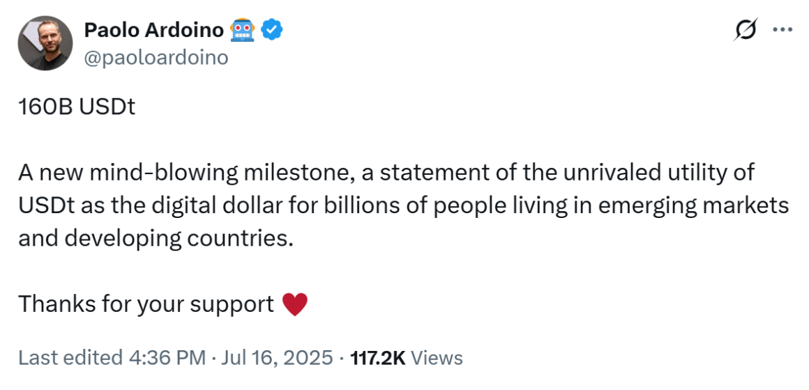 In a Thursday post on X, Ardoino called the achievement a testament to USDt’s growing role as the digital dollar for “billions of people living in emerging markets and developing countries.” USDt crossed $150 billion in May.