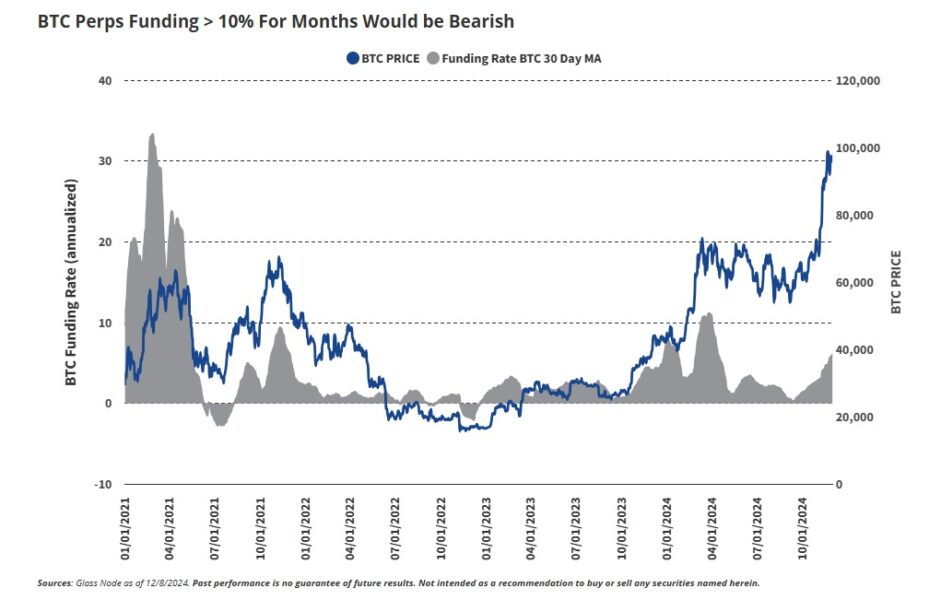 Sustained funding rates above 10% on BTC perpetual futures exchanges would indicate “speculative excess,” suggesting the crypto market has reached a local top, VanEck said.