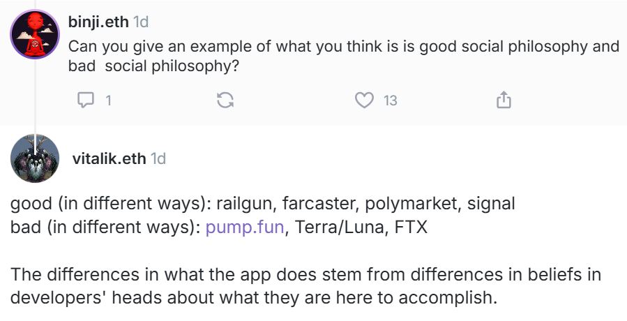 On the other hand, Buterin said the memecoin platform Pump.fun, the collapsed crypto ecosystem Terra, its native token Terra, and the collapsed crypto exchange FTX are examples of bad social philosophy.