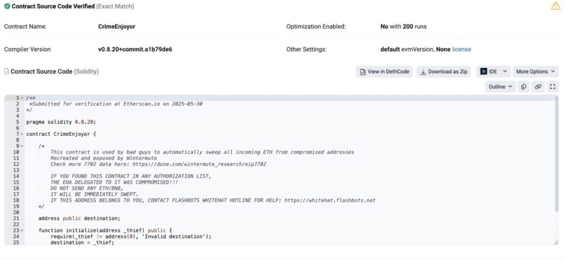 Wintermute’s code, dubbed “CrimeEnjoyor,” prints a warning within malicious Ethereum contracts that are “designed to auto-sweep funds” from wallets with leaked private keys, it said in a May 30 X post.